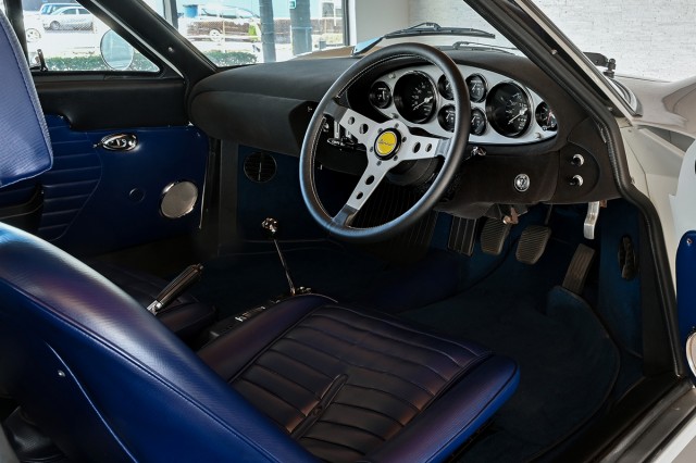 イギリスのインポーターである”Maranello Concessionaires Ltd”が、1971年の冬に開催されるロンドン・アールズコートモーターショーに展示するエキシビジョンカーとしてオーダーした個体が、今日ご紹介する”Dino 246GT c/n : 02524″です。ファクトリーのレコードによると、オーダーボディカラーは”Bianco Polo Park”、組み合わされるインテリアカラーはブルー、オプション装備としてパワーウィンドウが追加記載されています。モーターショーの展示後、ロンドンのディーラー”Dick Lovett”を経て、モータースポーツエンスージャストとして名高く、スターリング・モスを擁して、1961年のMonaco GPをはじめ、Goodwood Tourist Trophy等で数々の勝利を収めた、ロブ・ウォーカーレーシングチームの総帥、ロブ・ウォーカー氏にファーストデリバリーされました。